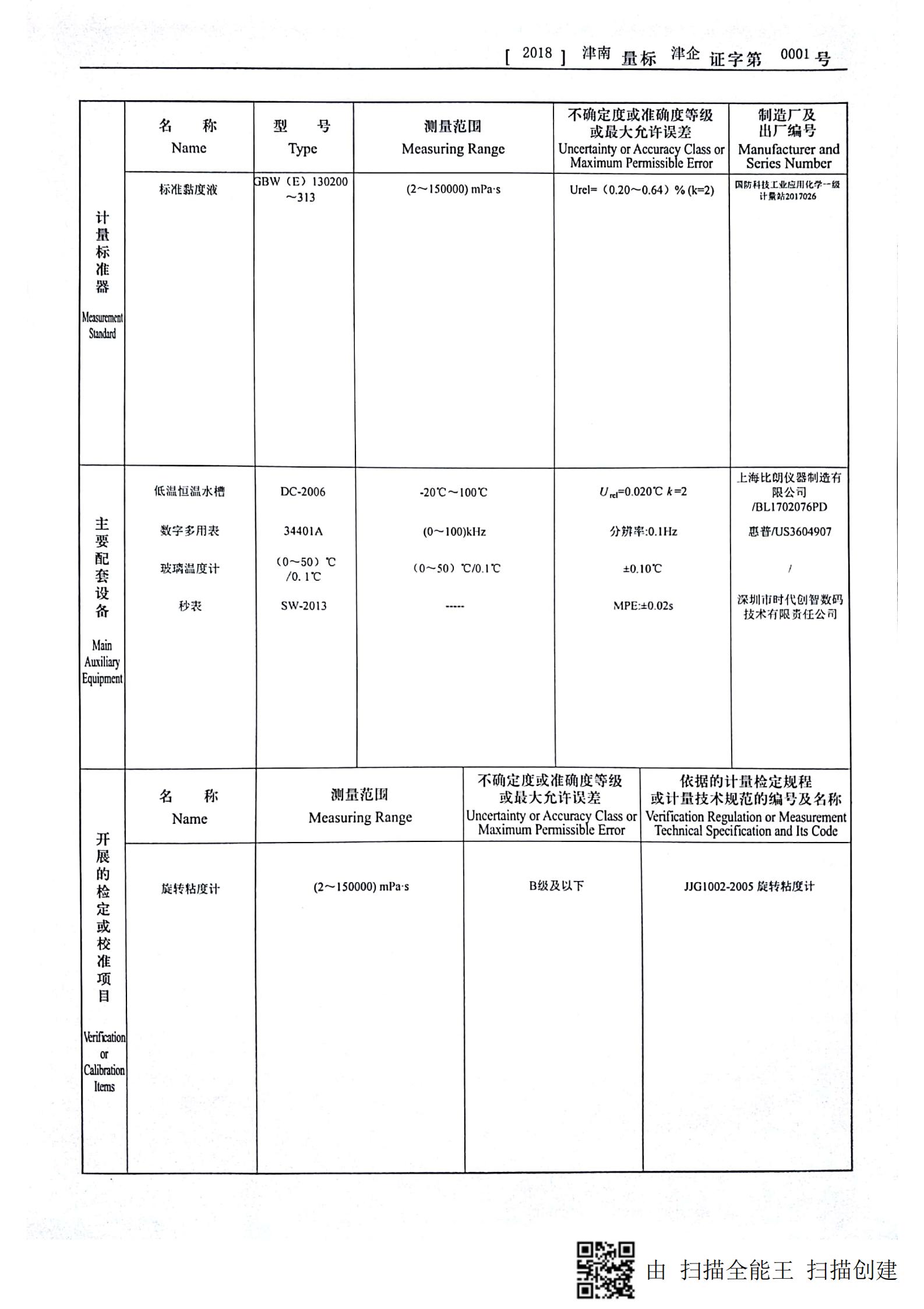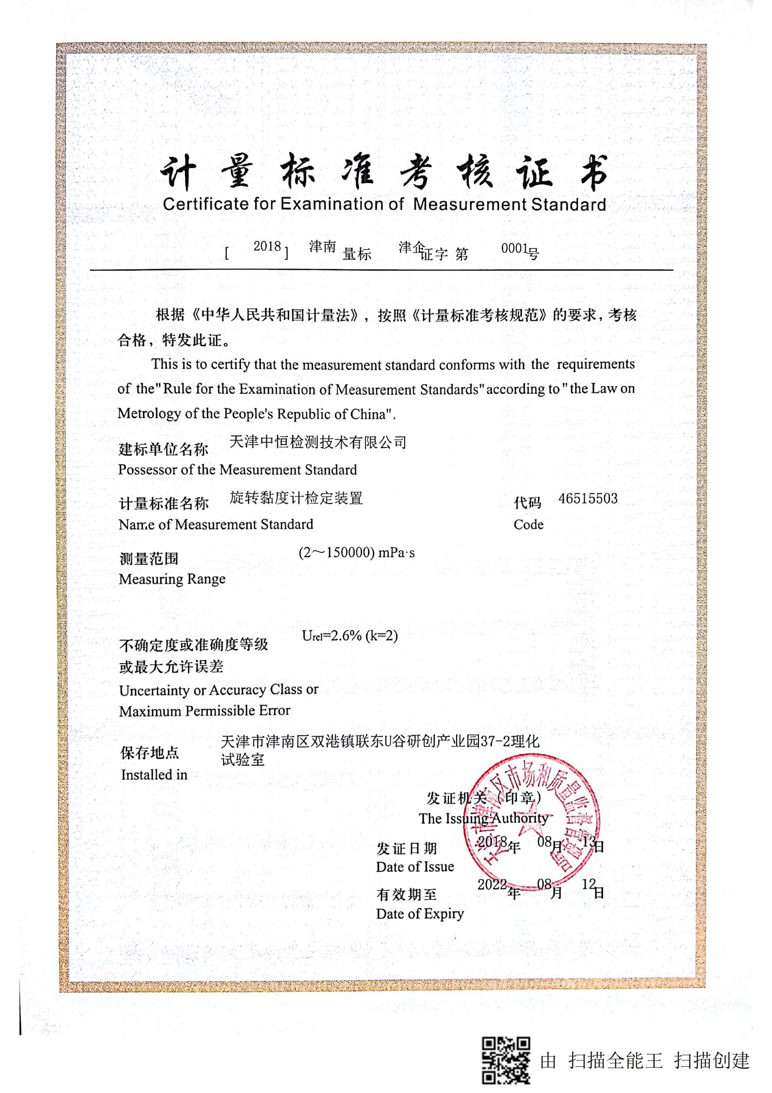 2018年08月13日,我实验室荣获了区市场和质量监督管理局颁发的“旋转黏度计检定装置”项目的《计量标准考核证书》,同时成为了津南区第一家获得该项证书的企业。